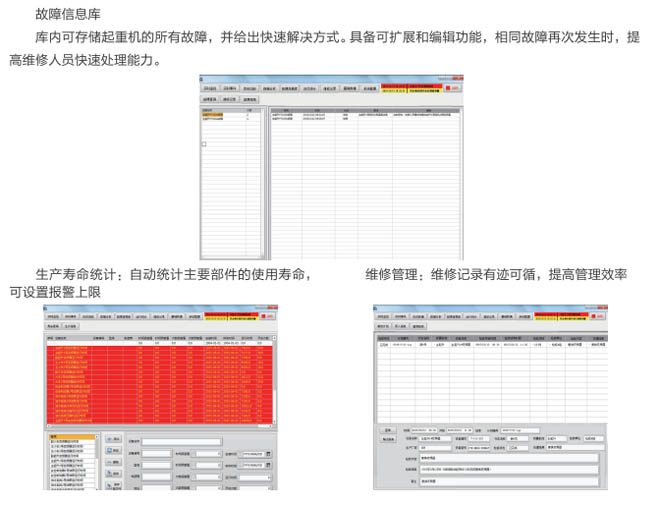 AGF系列起重機(jī)械安全監(jiān)控管理系統(tǒng)是我公司自主開(kāi)發(fā)研制的產(chǎn)品,按照國(guó)質(zhì)檢特聯(lián)【2011】137號(hào)文件的要求,嚴(yán)格執(zhí)行國(guó)標(biāo):GB/T 28264-2017生產(chǎn),廣泛用于各行業(yè)大型起重設(shè)備機(jī)械、提升機(jī)、架橋機(jī)、港機(jī)、工程機(jī)械等,系統(tǒng)是為各種起重機(jī)的運(yùn)行監(jiān)視、診斷分析、設(shè)備預(yù)警與檢修維護(hù)而搭建的信息系統(tǒng)管理平臺(tái)。系統(tǒng)實(shí)時(shí)記錄起重機(jī)的運(yùn)行參數(shù)、操作記錄,當(dāng)滿足故障條件和設(shè)置預(yù)警值時(shí),系統(tǒng)及時(shí)提醒和記錄各種事件信息,為起重機(jī)的操作人員和維護(hù)人員提供實(shí)時(shí)的、詳盡的歷史數(shù)據(jù)和分析報(bào)表。起重機(jī)安全監(jiān)控管理系統(tǒng)具有可靠穩(wěn)定性、靈活交互性、便捷易用性,是集實(shí)時(shí)監(jiān)控﹑故障報(bào)警﹑數(shù)據(jù)登錄﹑設(shè)備維護(hù)﹑運(yùn)行統(tǒng)計(jì)于一體的現(xiàn)代起重機(jī)綜合信息管理平臺(tái)。