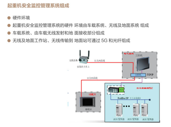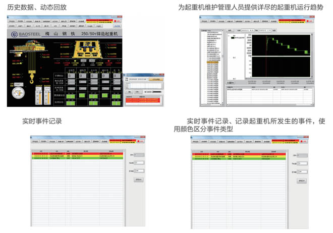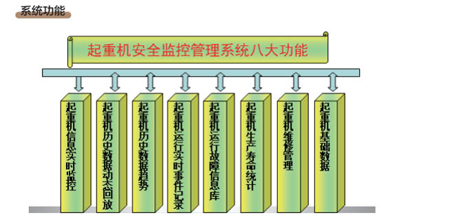 •- 通過(guò)起重機(jī)安全監(jiān)控管理系統(tǒng),運(yùn)行管理人員可以通過(guò)系統(tǒng)對(duì)起重機(jī)運(yùn)行中出現(xiàn)的故障進(jìn)行 查詢和處理;對(duì)設(shè)備及元器件進(jìn)行系統(tǒng)管理;指導(dǎo)定期對(duì)系統(tǒng)進(jìn)行維修和調(diào)試。系統(tǒng)具備以 下功能:實(shí)時(shí)狀態(tài)顯示、實(shí)時(shí)報(bào)警顯示、歷史記錄查詢、部件壽命監(jiān)測(cè)、事故診斷分析、數(shù) 據(jù)統(tǒng)計(jì)及權(quán)限設(shè)定管理等。