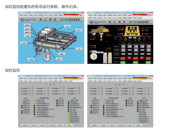 •-1、起重機(jī)狀態(tài)實(shí)時(shí)監(jiān)測(cè):對(duì)事故易發(fā)設(shè)備和重點(diǎn)關(guān)鍵設(shè)備的運(yùn)行情況進(jìn)行實(shí)時(shí)監(jiān)測(cè),同時(shí) 對(duì)采集的數(shù)據(jù)進(jìn)行分析整理,并把現(xiàn)場(chǎng)的實(shí)際數(shù)據(jù)與相關(guān)的設(shè)備運(yùn)行指標(biāo)進(jìn)行對(duì)比,超過(guò)偏 差限制時(shí)產(chǎn)生報(bào)警信息并存儲(chǔ)報(bào)警記錄。共享相關(guān)數(shù)據(jù),為及時(shí)發(fā)現(xiàn)和消除設(shè)備故障隱患提 供必要的數(shù)據(jù)支持。