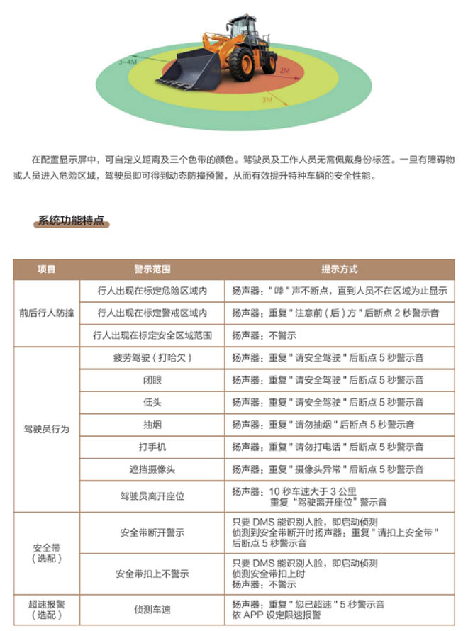 特種車輛智能識(shí)別防撞預(yù)警系統(tǒng)是專為工程車輛叉車、裝載機(jī)、挖掘機(jī)、推土機(jī)、礦山港口移動(dòng)車輛設(shè)備所設(shè)計(jì)的智能識(shí)別防撞預(yù)警安全裝置,能夠?qū)崟r(shí)偵測(cè)工作區(qū)域的危險(xiǎn)狀態(tài)并提供警示,有助于提升預(yù)防工程特種車輛作業(yè)安全。一旦有障礙物或人員進(jìn)入危險(xiǎn)區(qū)域,駕駛員可得到動(dòng)態(tài)防撞預(yù)警并發(fā)出報(bào)警進(jìn)行實(shí)時(shí)減速或停車,該系統(tǒng)能在各種復(fù)雜廠區(qū)路況及工礦環(huán)境中幫助駕駛員避免危險(xiǎn),預(yù)防事故發(fā)生減輕壓力,提供豐富的駕駛員輔助環(huán)境感知等功能